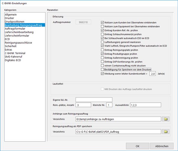 Mit Haken markierte Parameter werden bei der Eingabe im Reinigungsauftrag geprüft, an ggfs. fehlende Eingaben wird dann durch ein Hinweisfenster erinnert.