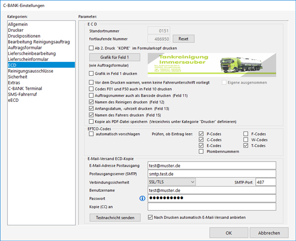 Es gibt Ladestellen, die ECDs mit den kammerbezogenen EFTCO-Codes F01 (Reinigung mit Trinkwasser) und F50 (Lebensmittelreiniger) nur akzeptieren, wenn diese als tankbezogene Codes im Feld 10 des ECDs gedruckt werden. Diese Option kann in C-BANK ebenfalls eingestellt werden.