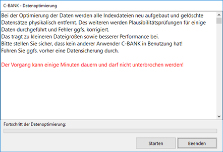 Für diese Aktion ist ein exklusiver Datenzugriff erforderlich. Vor einer Optimierung ist es empfehlenswert, eine Sicherung der Datenbank durchzuführen.