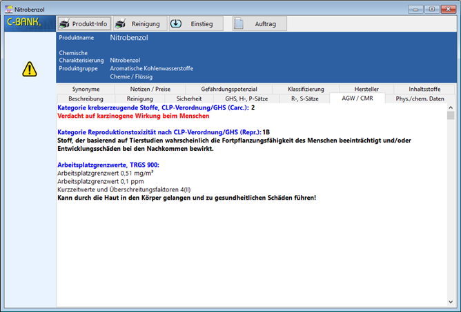 Im Register AGW-Werte des Detailfensters werden für das ausgewählte Produkt die AGW-Werte angezeigt (falls vorhanden).