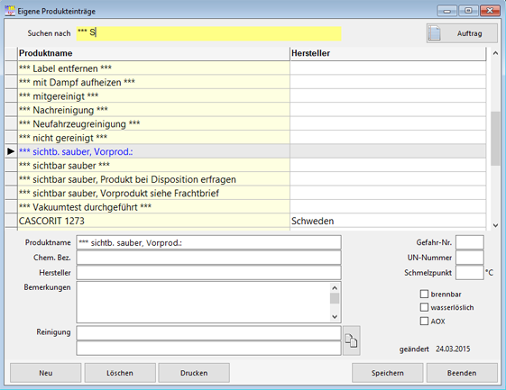 Die Suche nach Produkten erfolgt in gleicher Weise, wie bei der Suche nach Produktnamen. Während der Eingabe des Suchbegriffs beginnt bereits die Suche und gefundene Produkte werden in der Auswahlliste angezeigt. Ein kleines Dreieck markiert das ausgewählte Produkt. Im Detailbereich sind die Informationen sichtbar, die zu dem Produkt vom Anwender eingetragen wurden.