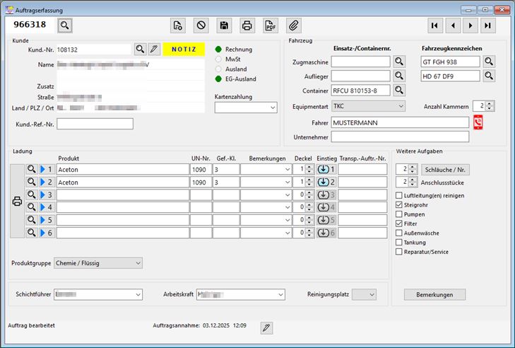 Danach empfiehlt es sich, die weitere Bearbeitung des Formulars gegen den Uhrzeigersinn durchzuführen. D.h. zunächst alle Einträge rund um Produkt, Behälter und weitere Aufgaben zu machen. Danach können über die Suche nach Kennzeichen und/oder Containernummer die Fahrzeugdaten eingetragen werden. Ist das Fahrzeug und/oder der Container bereits in der Equipmenttabelle enthalten, wird ein dort hinterlegter Kunde direkt in das Feld für den Kunden übernommen. Ein Kunde kann auch separat in der Kundentabelle gesucht und in den Auftrag übernommen werden. Die Suche in den Stammdatentabellen ist in allen Eingabefeldern mit einem daneben abgebildeten Lupensymbol möglich. Werden in den Stammdatentabellen keine Einträge gefunden, können die gewünschten Daten immer auch per direkter Tastatureingabe in die Felder eingetragen werden. Equipmentdaten werden dabei beim Speichern des Auftrags in die Stammdaten übernommen, so dass sie beim nächsten Auftrag bereits zur Verfügung stehen. Um einen Kunden unter Umgehung der Kundentabelle einzutragen, genügt ein Klick auf das Symbol mit dem Bleistift neben dem Ausgabefeld für die Kundennummer.