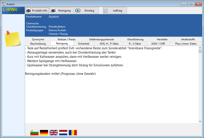 Im Register Reinigung des Detailfensters werden für das ausgewählte Produkt Informationen gegeben, ob und wie das Produkt gereinigt werden kann. Die Angaben erfolgen meist in mehreren Schritten, die auch die Behandlung von Produktresten und erforderliche Leistungen wie z.B. Absauganlage berücksichtigt.