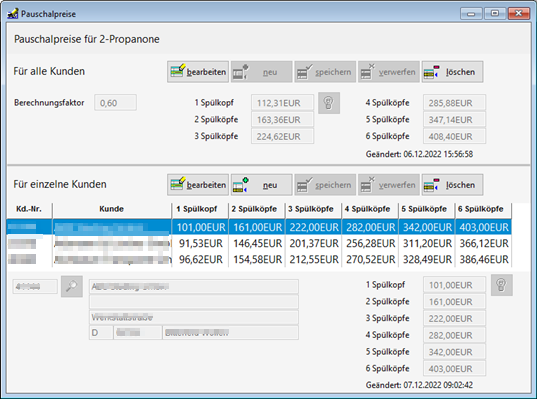 Zu jedem in C-BANK enthaltenen Produkt können Pauschalpreise für alle Kunden oder auch individuell für einzelne Kunden hinterlegt werden. Es werden jeweils sechs verschiedene Pauschalpreise für ein bis sechs Spülköpfe bzw. Kammern unterschieden. Die Pauschalpreisverwaltung erfolgt in der Detailanzeige zu den Produkten im Bereich "Notizen/Preise". Aus dem Pauschalpreis für einen Spülkopf können automatisch die Preise für mehrere Spülköpfe berechnet werden. Für diese Berechnung kann ein Bewertungsfaktor festgelegt werden (Bsp. Faktor = 1 => Umrechnung erfolgt proportional, Faktor = 0,4 => zwei Spülköpfe kosten 40% mehr als ein Spülkopf). Änderungen an jedem Pauschalpreis werden mit einem Zeitstempel dokumentiert und angezeigt.
