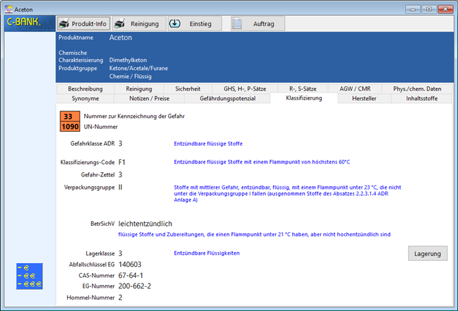 Man unterscheidet die Klassifizierung nach Transporten auf der Straße nach GGVS und ADR, auf der Schiene nach GGVE und RID und auf dem Binnen- und Seeweg nach ADNR bzw. GGVSee. In C-BANK sind die für den Straßentransport relevanten Klassifizierungen nach den beiden Verordnungen GGVS (Gefahrgutverordnung Straße) und ADR (europ. Übereinkommen internationaler Beförderungen auf der Straße) aufgenommen. Im Register Klassifizierung des Detailfensters wird diese Klassifizierung angezeigt.