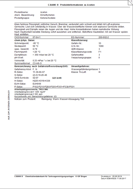 Mit dem Schaltfeld Datenblatt im Detailfenster werden alle zur Verfügung stehenden Produktdaten auf dem Standarddrucker ausgedruckt. Unter dem Menüpunkt Datei – Grundeinstellungen kann für die C-BANK-Ausdrucke ein anderer Drucker als der Standarddrucker eingestellt werden.