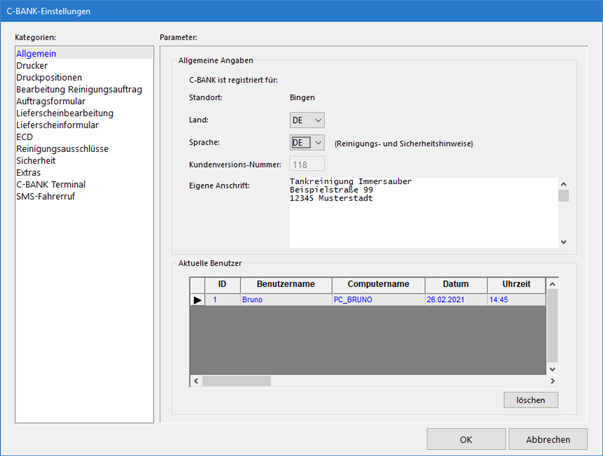 Im Bereich Aktuelle Benutzer kann man sehen welche Benutzer in C-BANK eingeloggt ist. Evtl. "verlorene" Nutzer (z.B. durch Programmabstürze) können hier gelöscht werden.