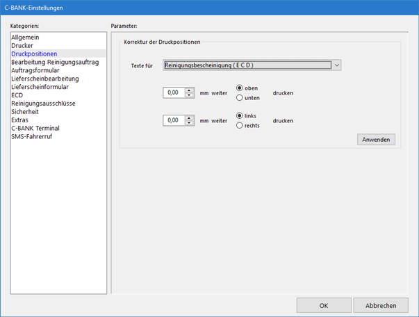 Hier können die Druckpositionen für den Ausdruck auf Formulare horizontal und vertikal verschoben werden.