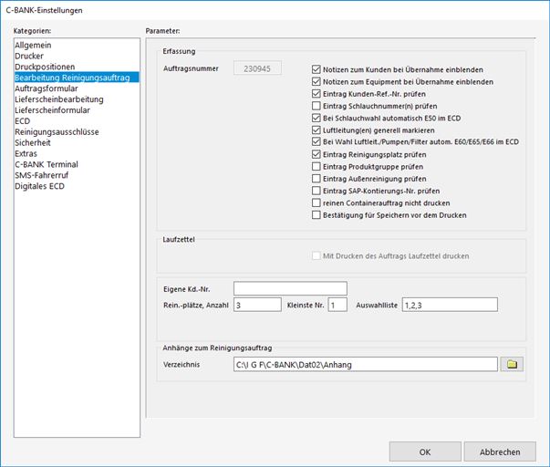 Anhänge zu Reinigungsaufträgen wie Bilder oder auch andere Dokumente werden standardmäßig in einem Unterverzeichnis "Anhang" des Verzeichnisses "\Dat02" der C-BANK-Installation gespeichert. Der Ordner kann aber hier in einen beliebigen anderen Ort geändert werden.