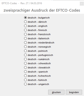 Um auch fremdsprachigen Fahrern einen Überblick über die EFTCO-Codes zu geben, können diese aus C-BANK in einer zweisprachigen Tabelle - Deutsch und eine auszuwählende Sprache - gedruckt werden.