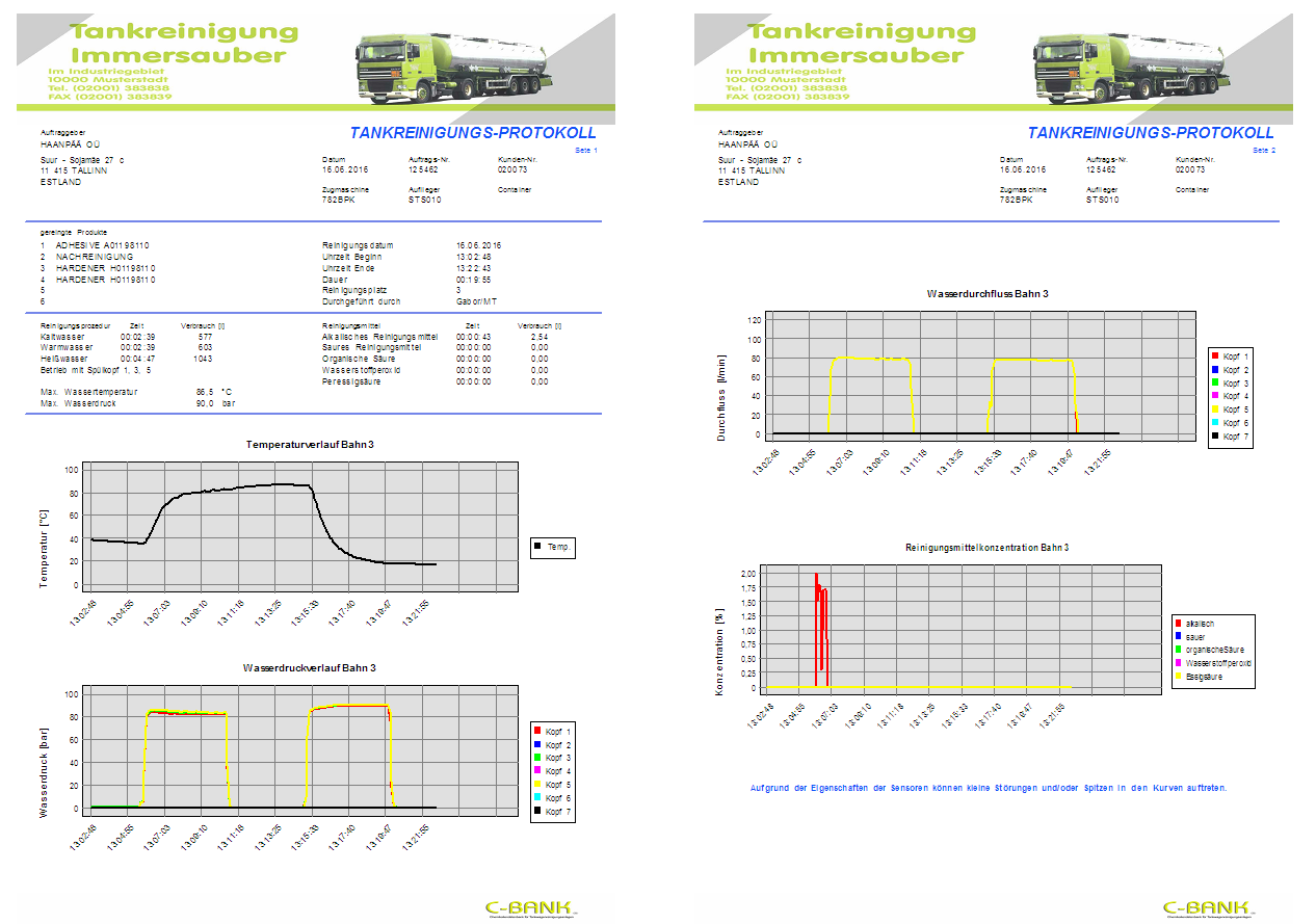 Sofern es eine Schnittstelle zwischen C-BANK und der Anlagensteuerung gibt, sind Protokollierung von Wassertemperatur, Wasserdruck, Reinigungsmittelwahl und -konzentration sowie weiterer Parameter möglich. Die Erfassung wird einem Auftrag zugeordnet und wird als Protokoll gedruckt.