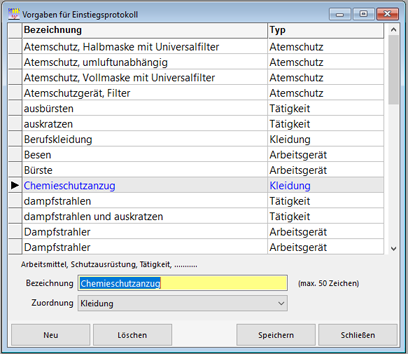Die Vorgaben für den Befahrerlaubnisschein werden in verschiedenen Auswahllisten während der Bearbeitung des Befahrerlaubnisscheins verwendet. Als Standardtexte können sie unter dem Menüpunkt „Stammdaten - Befahrerlaubnisschein" bearbeitet werden. Damit im jeweiligen Auswahlfeld des Einstiegsprotokolls nur sinnvolle Einträge zur Auswahl stehen, wird jedem Eintrag eine entsprechende Kategorie zugeordnet.