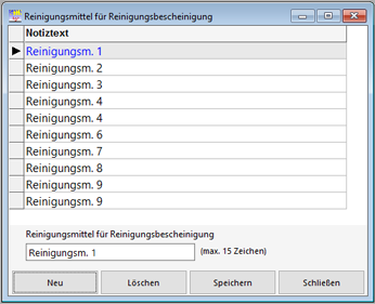 Die Vorgaben für die Standardtexte Reinigungsmittel (Bescheinigung) werden während der Bearbeitung der Reinigungsbescheinigung verwendet. Als Standardtexte können sie unter dem Menüpunkt „Stammdaten -Standardtexte - Reinigungsmittel (Bescheinigung)" bearbeitet werden.