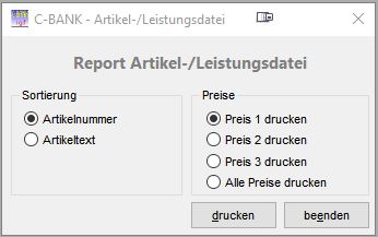 Zum Drucken einer Liste aller Artikel/Leistungen kann die Sortierung und ein Filter gewählt werden.