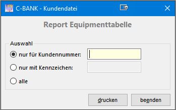 C-BANK-HilfeHauptmenüMenüsDateiDrucken Equipment Drucken Equipment Zum Drucken einer Equipmentliste kann ein Filter gewählt werden. Nach der Wahl eines Filter kann das Ausgabemedium gewählt werden. Neben der Ausgabe auf einem Drucker ist unter anderem auch die Ausgabe als PDF möglich.