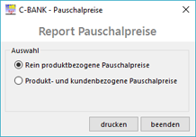 Pauschalpreise die unter den Stammdaten gepflegt werden, können unter diesem Menüpunkt als Liste gedruckt werden. Zunächst wird ein Bildschirmformular mit einer Auswahlmöglichkeit zum Drucken von produktbezogenen Pauschalpreisen oder kunden- und produktbezogenen Pauschalpreisen geöffnet.