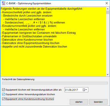 Optional können auch Daten von Equipment gelöscht werden, das schon längere Zeit nicht mehr zur Reinigung war. Auf diese Weise werden z.B. Fahrzeuge, Tanks und Container, die nicht mehr existieren, aus der Tabelle entfernt.