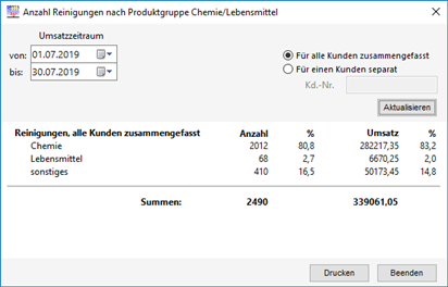 Über einen zu wählenden Zeitraum wird die Anzahl der Reinigungen pro Produktgruppe Chemie oder Lebensmittel mit Umsatz angezeigt. Die Anzeige kann über die Kundennummer auch auf einen einzelnen Kunden eingeschränkt werden. Das Ergebnis lässt sich auf dem Drucker ausgeben.