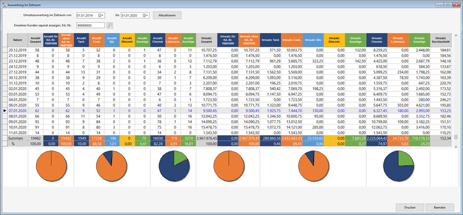 Über den Menüpunkt "Extras - Statistik - Umsatzauswertung im Zeitraum" lässt sich aus den Auftragsdaten für einen Zeitraum eine sehr umfangreiche Tabelle mit Anzahl Reinigungen und Umsätzen generieren. Ein einzelner Kunde kann zum Vergleich separat dargestellt werden.