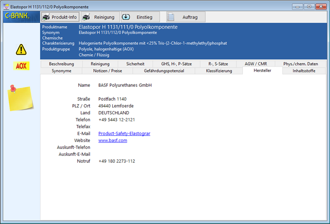 Zu Handelsprodukten ist hier der Hersteller mit Name und Kontaktdaten wie Telefon, E-Mail-Adresse, Notrufnummer usw. einsehbar.